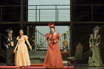 Autour de lui, les femmes forme un quatuor vocal qui pérore et roucoule avec autant d’aplomb que de charme et de musicalité. La belle Anna Caterina Antonacci, souvent vue et entendue dans des rôles tragiques, est plutôt inattendue en Alice Ford manipulatrice mais se révèle parfaitement à l’aise dans la légèreté, Caitlin Hulcup est l’élégante Meg Page, la délicieuse Amel Brahim-Dejelloul, récemment découverte dans Véronique au Châtelet (voir webthea du 25 janvier 2008) compose une Nanette idéale et l’impayable Marie-Nicole Lemieux en Mrs Quickly joue à merveille de ses graves de contralto pour chauffer les « révérences » de l’entremetteuse aux cent tours. Les hommes ne sont pas en reste avec l’excellent ténor Francesco Meli en amoureux parfait de la jolie Nanetta et surtout Ludovic Tézier en Ford mordu de jalousie, baryton français qui, de rôle en rôle, confirme sa place dans la cour des grands. Enfin, ultime joker dans le choix des interprètes, la plupart sont italiens – et ceux qui ne le sont pas en maîtrisent la langue – si bien que le plaisir des voix se double par celui de la diction où chaque syllabe trouve sa place.