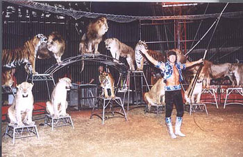 Les lions et tigres entre en clignant des yeux sous l’effet des projecteurs, ils s’installent très lentement au gré de leur propre silence en faisant comprendre du bout de la queue et par des rictus de babines qu’ils iront là où ils doivent aller quand ils le voudront. Après prise de possession des lieux : passages dans les cerceaux de feux, sauts de tabourets, coquetterie inattendue envers le dompteur etc. Autant d’exercices que l’on connaît déjà mais que l’on attend et regarde à chaque fois avec le même émerveillement. Emerveillement devant ces performances vivantes en direct. Le dompteur Frédéric Edelstein possède une maîtrise tranquille et sympathique, il arbore un sourire délicatement contenu de sérénité qui donne une tension curieuse à la scène.
