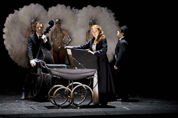 Olivier Py balance son Rake’s Progress sous les feux des néons du musical. Des tubulures noires forment des échafaudages mobiles qui se transportent d’un lieu à l’autre, de la chambre d’amour à celle du bordel de Mother Goose qui a des allures de Mrs Knife, le personnage de travesti inventé et joué par Olivier Py dans ses numéros de chanteur de cabaret. La foire où s’exhibe Baba la Turque avec son nain, ses clowns, ses jongleurs et acrobates, la salle des ventes de la liquidation des dernières richesses, la machine à transformer les pierres en pains, le cimetière, l’asile, tout défile dans ce mouvement perpétuel en noir et blanc et débauche de néons clignotant tous azimut. Entre Moulin Rouge, ses girls emplumées et ses boys bodybuildés, et Foire du Trône avec monstres divers, on bouge beaucoup, on danse, on copule par devant par derrière… Le chemin de débauche piloté par l’émissaire du diable qu’est Nick Shadow trace son infernale spirale à coups de symboles, un sablier, un crâne, un drapeau rouge et le poing levé des ouvriers en colère : le temps, la mort, la lutte des classes et la bataille éternelle du bien contre le mal.