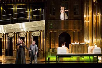 Dire que le parti-pris d’Olivier Py se situe à l’inverse relève de l’euphémisme. L’Egypte pharaonique est mise au placard et remplacée par une Italie en devenir, celle du Risorgimento, du siècle de Victor Emmanuel Rei d’Italia, une Italie guerrière gonflée par le gigantisme des décors de Pierre-André Weitz, l’habituel complice de Py, ses échafaudages, ses galeries suspendues, ses miroitements aquatiques, ses néons en sous-sol, et la rutilance de ses ors, cuivres et bronzes qui viennent chatouiller les yeux des spectateurs. Les idées d’Olivier Py se suivent à un rythme d’enfer, chaque scène, chaque plan véhicule un point de vue, une allusion. Allusion à la guerre avec ses soldats en treillis, son tank, ses armes et ses morts. Allusion à la politique avec ses manifestants brandissant des banderoles xénophobes et nationalistes. Allusion à l’emprise envahissante des religions avec le culte d’Isis détourné vers un christianisme perverti par le Ku Klux Kan. La beauté esthétique de certains effets est indéniable, comme cet Arc de Triomphe flamboyant sous lequel la victoire est dansée par une ballerine en tutu tandis que dans les soubassements s’entassent les cadavres.