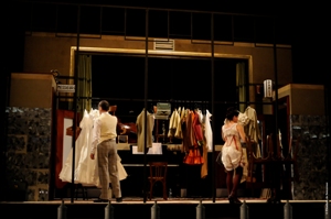 Un décor à mi-chemin entre bistrot et vestiaire – ou vestiaire de bistrot – avec un bout de penderie pour les costumes, un piano au centre, et, face à face, cour et jardin, les « lieux d’aisances » « Messieurs » et « Dames ». L’humour pince sans rire est donné d’entrée de jeu : le spectacle démarre sur quinze minutes d’entracte, avec vin chaud et boissons fraîches... Les trois coups chers au théâtre retentiront au bout d’une bonne demi heure de jeu...
