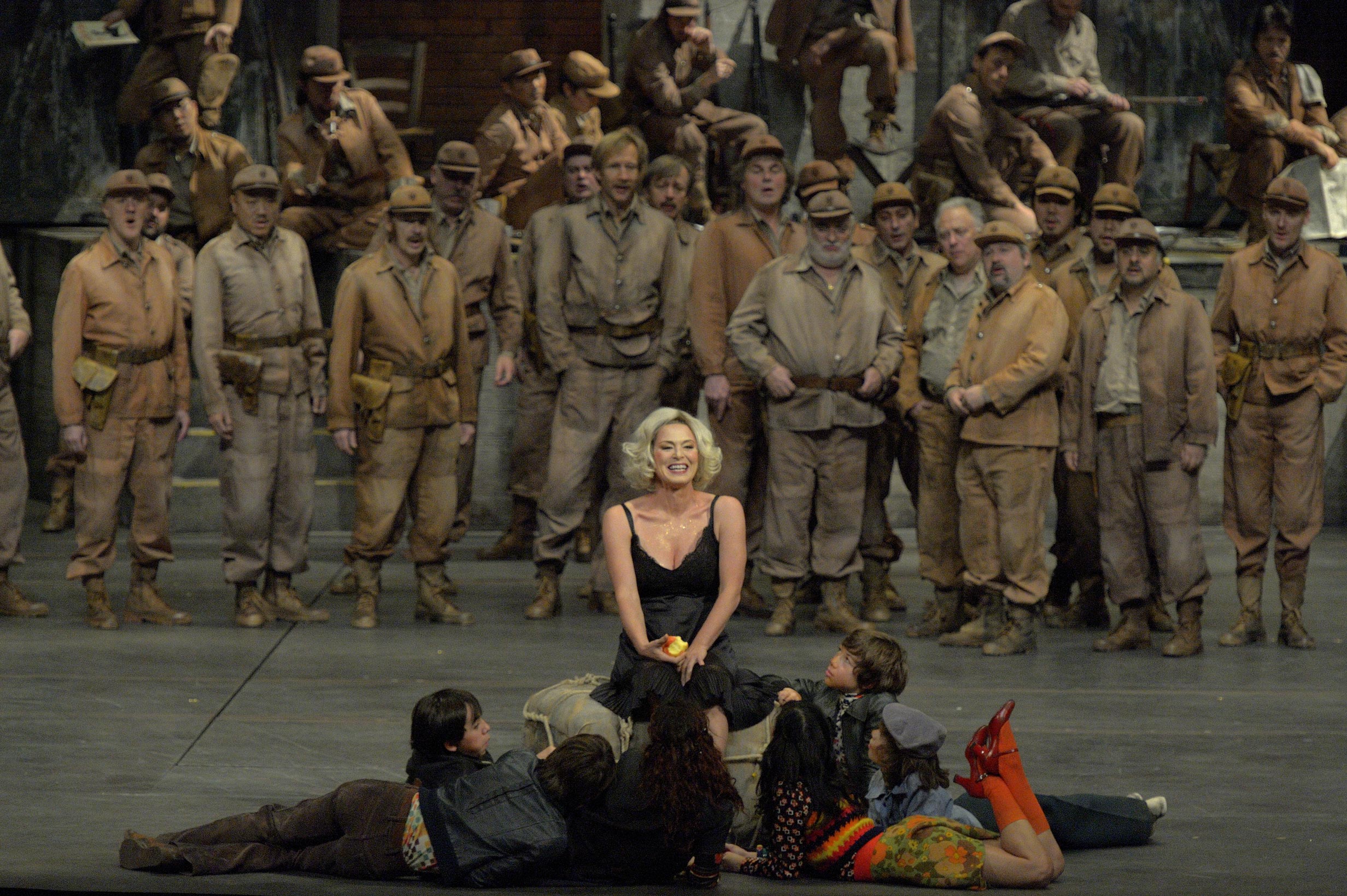 On se réjouissait de retrouver la pulpeuse Anna Caterina Antonacci, mezzo soprano d’exception qui fut, il y a trois ans, une Carmen d’anthologie à l’Opéra Comique (voir WT du 18 juin 2009) mais on la cherche en vain sous la perruque blonde d’une Marilyn de brocante. Elle semble errer dans les foules inutiles que les chœurs souvent en décalages ont du mal à justifier. Gracile dans sa petite robe noire pailletée, la voix d’habitude si somptueuse (sa Médée de Cherubini, sa Juive de Halevy ne s’oublient pas...) est soudain éteinte, elle a l’air de se demander ce qu’elle fait là.