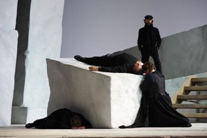 Noire et blanche, la Sicile de Cavalliera Rusticana est illustrée par des blocs superposés de craie blanche pour figurer le village mangé de soleil et suggérer l’entrée de l’église où est célébrée la messe de Pâques mais qu’on ne voit pas. Tous les personnages sont vêtus de noir, les solistes tout comme le chœur en procession christique se flagellant en mémoire du martyr de Jésus un certain vendredi saint. Violetta Urmana ne maîtrise pas toujours son vibrato mais campe une belle Santuzza, Marcello Giordani, l’infidèle, a du muscle, de la puissance mais manque de style, Franck Ferrari en mari trompé, la voix grasse et la grimace à fleur de lèvres pourrait remporter la palme du ridicule. Restent, dans les rôles secondaires de Lucia et Lola, Stefania Toczyska et Nicole Piccolomini qui tirent joliment leur épingle du jeu.