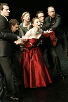 Le travail de Declan Donnellan est d’un raffinement et d’une élégance magnifique mais, surtout, sa mise en scène est, en elle-même, un éloge de l’acteur et du théâtre selon Shakespeare. Point de décor encombrant un plateau nu sur lequel évolue la douzaine de comédiens. Deux lourdes tentures bleu nuit suspendues dans les cintres occupent l’espace. Les lieux sont essentiellement figurés par un subtil jeu de lumières par lequel on est tour à tour au palais du roi, dans la forêt, dans une taverne italienne ou sur les docks. Les scènes, avec une belle fluidité, se succèdent en fondu enchaîné. La bande son, très habilement travaillée, contribue amplement à la tonalité générale. Les acteurs, tous admirables, conduisent ces aventures avec force et maîtrise, avec une énergie intelligente, une générosité simple et un plaisir du jeu communicatif. Jodie McNee incarne une Imogène incroyablement moderne, vive, attachante. Un personnage féminin d’une rare modernité, un vrai caractère, entier et droit. Magnifique aussi l’interprétation de Tom Hiddleston, qui se glisse alternativement dans la peau de Cloten et de son contraire Posthumus. Changement à vue , un imperméable, une bague passée au doigt, une paire de lunette et la transformation est opérée.