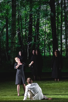 Carsen tourne le dos aux symboles de la maçonnerie. Pas le moindre triangle, pas le plus petit compas se profilent dans les branchages de la forêt en perspectives déclinantes qui lui sert de décor au premier acte et à la fin du deuxième. Ni sur la pelouse verte trouée de trois tombes et qui entoure la fosse d’orchestre comme un ruban, la transformant en fosse funèbre. Aucun n’indice non plus au début du deuxième acte quand la scène se transforme en soubassement d’outre-tombe, accessible par une vertigineuse échelle, parsemée de cercueils et même d’un squelette. C’est dans ce ventre de terre meuble que Carsen fait se dérouler les passages de l’initiation. Des projections subtiles font traverser les quatre saisons, posent des murailles en transparence, comme des apparitions. Il y a de la magie et du mystère qui volètent dans l’air.