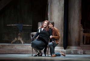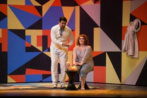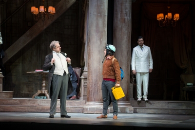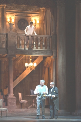 Stéphane Roche, homme de théâtre et de musique, qui fut l’assistant de nombreux maîtres de la scène lyrique (Kokkos, Lavelli, Marthaler, Nicolas Joël dont il a assuré des reprises), signe ici sa première réalisation à part entière. Avec un mélange de réserve et de fantaisie, ainsi qu’une attention diligente à la direction d’acteurs. Les décors de Bruno de Lavenère chevauchent entre deux générations qui se découvrent au gré d’une muraille pivotante. D’un côté un intérieur bourgeois cossu, avec colonnades, mezzanine et lustres - le logis du vieux qui donne des ordres à un brave domestique muet – et, de l’autre des façades tantôt colorées de figures géométrique, tantôt envahie de publicités, une Ferrari écarlate et l’affiche de la Dolce Vita de Fellini. Un vélo, une Vespa-Lambretta, un crayon géant descendant des cintres, un arbre sans feuillage, une balançoire en plastique, des voyous en perruques bleues... En quelque sorte un bric-à-brac hétéroclite jailli des années 50/60 dont on pourrait faire un inventaire à la Prévert.