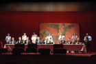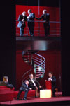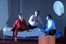 Jean-Claude Berutti, l’actuel directeur de la Comédie de Saint-Etienne, déplace l’action de l’antiquité grecque à nos jours dans un décor de palace des années vingt, velours grenat et mobilier design signé Rudy Sabounghi. Le festin tourne à la soirée mondaine en smoking et nœud pap, champagne à gogo...