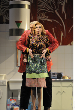 Il est la proie des moqueries d’une bande de mégères petites bourgeoises qui se vengent sur lui de leurs existences mesquines. Des commères plus vipères que joyeuses, anglaises jusqu’au bout de leurs cheveux permanentés, dans leurs appartements aux papiers peints criards – so very british – En survêtement rose, Alice Ford – l’irrésistible Véronique Gens en potiche middle class – fait du vélo d’appartement et complote avec ses copines, Mrs Quickly arrimée à son fume cigarette et à ses « révérences » (la piquante Elena Zilio) et la faussement bêtasse Meg Page (Leah-Marian Jones joliment oie blanche rebelle). Nanetta et Fenton, les amoureux, sortent de la fadeur de leur cliché routinier et deviennent des ados remuants en jean et mini-jupe (Luciano Botelho et l’adorable Amanda Forsythe, tous deux vif argents).