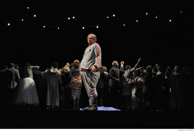 Mise en scène, décors et costumes fourmillent de trouvailles. On passe du vaudeville au drame en passant par le cabaret. Dans la cuisine de Mrs Ford, des employés en salopettes bleues siglées DIRTY installent une chaudière avant d’aider à verser dans la Tamise le panier à linge contenant le gros héros de la farce. Qui revient dans sa chambrette de pension de famille, trempé jusqu’au nombril, se déshabille exhibant malgré lui sa carcasse aux gros plis de graisse, puis se prépare au nouveau rendez-vous galant en enfilant une chemise à jabot jaune et une veste de rocker à paillettes. Le rendez-vous est fixé à minuit sous le chêne de la forêt. Un arrêt de bus y mène, les villageois mettront en court circuit son éclairage avant de se livrer à leur pantomime de bazar. Piégé, Falstaff, malin, trouve la conclusion dans un éclat de rire tragi-comique : « tutto nel mondo è burla – le monde entier est une farce !