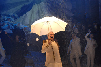 Il est le pion docile de l’étrange échiquier mis en place par le metteur en scène italien Stefano Poda qui retourne l’œuvre comme un gant, transformant la farce en conte de fées mystique. En noir et blanc dans un décor en perspectives couleur sable avec en toile de fond une sorte de soleil éclaté d’où les personnages surgissent ou derrière lequel ils se camouflent en position d’espions ou de voyeurs. Des figurants danseurs, acrobates, déploient des banderoles explicatives à la façon du théâtre de Brecht. Les costumes semblent empruntés au music hall, en blanc et noir, froufrous et chapeaux pointus. Les trois commères arborent des robes du soir et se coiffent de gigantesques chapeaux en choux de Bruxelles dilatés, d’abord en blanc puis en noir au dernier acte. Déluges de projections vidéos, lumières sophistiquées souvent de toute beauté, les détournements poétiques de Poda agissent pourtant à contre sens. Le chêne du rendez-vous nocturne devient une croix, on est en plein délire christique. C’est joli, bien fait mais ce n’est pas Falstaff.