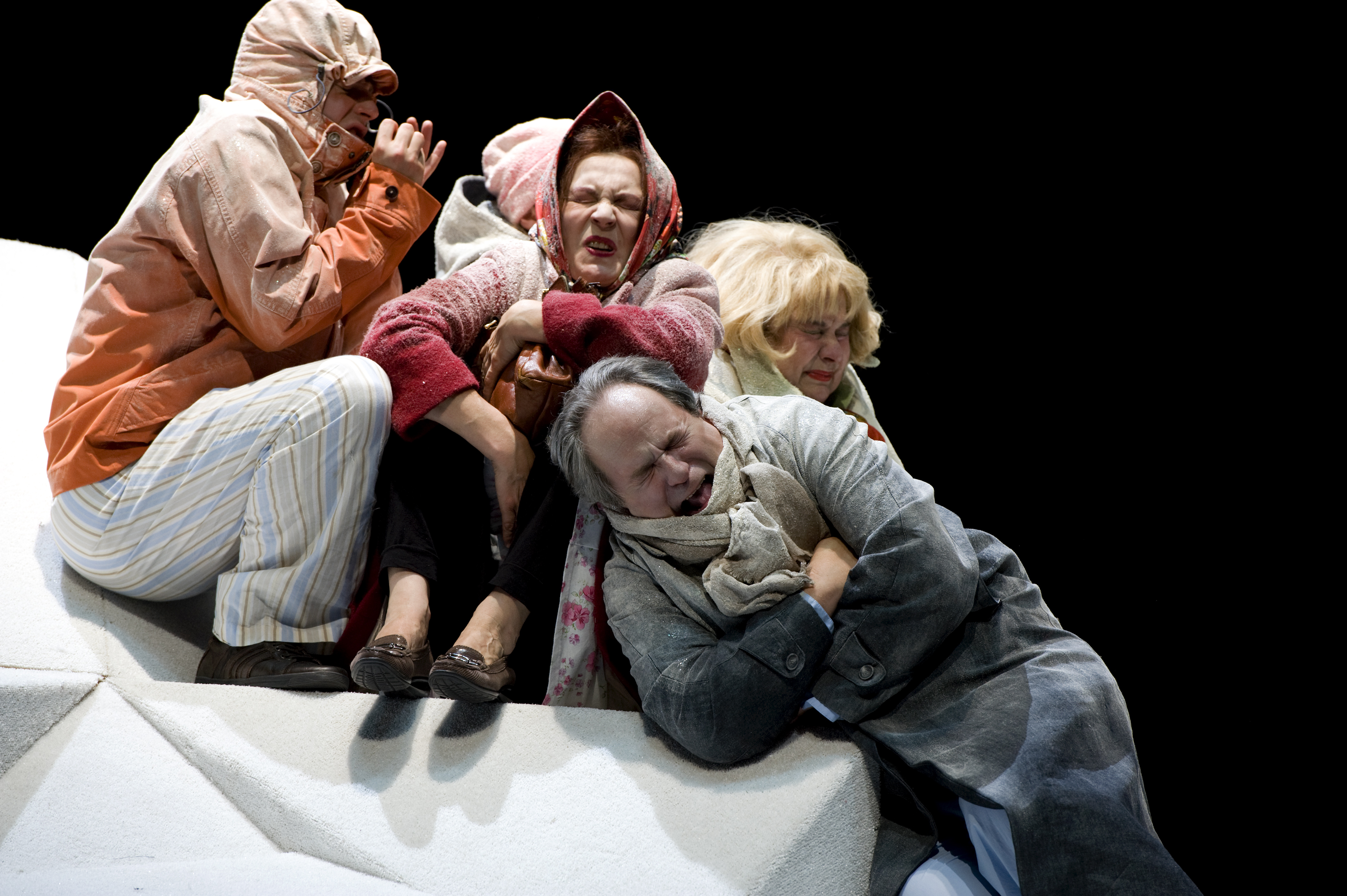 L’argument repose sur un dilemme tragique : comment échapper aux funérailles d’une vieille tante morte subitement qui doivent avoir lieu le lendemain, jour du mariage tant attendu de la fille de la maison ? Le pauvre orphelin, qui n’est pas dupe des enjeux disproportionnés, se lance dans une course poursuite ahurissante qui finit sur la plage de Tel Aviv sous les yeux de deux joggers invétérés, obsédés par leur hygiène corporelle, pour rattraper les membres de cette famille odieuse, prêts à toutes les bassesses et à toutes les extravagances pour que la fête ait lieu. Car « qu’est-ce qu’on va faire des 400 invités et des 800 poulets » répète à l’envi la mère de la fiancée (Christine Murillo), grosse bourgeoise méchante qui morigène son benêt de mari : « Quand on ne veut pas avoir des ennuis, on n’ouvre pas la porte ». Et la belle-mère (Christiane Millet), poissarde au langage fleuri, capable de renvoyer la Mort elle-même à ses affaires, de renchérir : « c’est quoi cette famille où on meurt la veille d’un mariage, en hiver, la nuit en plus ! ». C’est une Christine Murillo survoltée, éruptive qui mène la danse à un train d’enfer, jusqu’au sommet de l’Himalya, et que ceux qui ne peuvent pas suivre crèvent sur place, « on ne ramasse pas » ! Les femmes sont des furies nocives et les hommes des êtres falots dont la seule ambition est de fonder une famille, acheter un appartement et organiser le mariage de leur fille. Quand aux enfants, difficile de trouver plus niaiseux. Si Levin a une vision noire de l’humanité, il porte sur ses personnages un regard de « tendresse de pitié », comme dirait Albert Cohen et nous sauve du désespoir par l’humour parfois très potache. Tels des pingouins égarés sur la banquise de leur solitude, grelottant sur la plage ou perdus dans les neiges éternelles, ces pauvres hères, victimes de l’humaine condition, finissent par exhaler leur toute petite âme dans un pet sonore qui dégonfle leur corps comme une baudruche dérisoire.