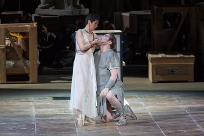 Ces « natures mortes » s’animent. César descend de son socle en costume couleur de pierraille, Cléopâtre se love et rebondit sur sa propre statue, Nireno, son confident se déplace de profil comme sur les fresques antiques… Les trouvailles jaillissent en incongruités ciblées, toutes sortes de facéties colorent la mosaïque des nombreuses arias da capo, tantôt comiques, tantôt dramatiques.
