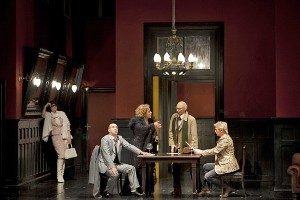 On avait découvert Tcherniakov à Paris par son extraordinaire mise en abyme d’Eugène Onéguine de Tchaïkovski puis par un très singulier Macbeth de Verdi (voir WT des 8 septembre 2008 et 9 avril 2009). Comme pour Onéguine, il opte pour un lieu unique dont il a lui-même conçu la scénographie : le rez-de-chaussée d’une villa à l’abandon, murs pourpres, baies encadrées de noir, quelques chaises baladeuses et un divan… Il y convoque les principaux protagonistes de la tragédie : cinq personnages en quête d’identité y révèlent la violence mortifère de leurs passions. Exit les rôles secondaires d’Inès, Ruiz, Zingaro et du messager, les textes de leurs interventions sont adroitement redistribués pour le quintet en scène. Des déguisements, perruques et lunettes noires peu à peu tombent jusqu’au moment de vérité où le passé renoue avec le présent, où la violence évoquée devient réelle et clôt l’histoire telle que Verdi et ses librettistes l’avaient voulue.