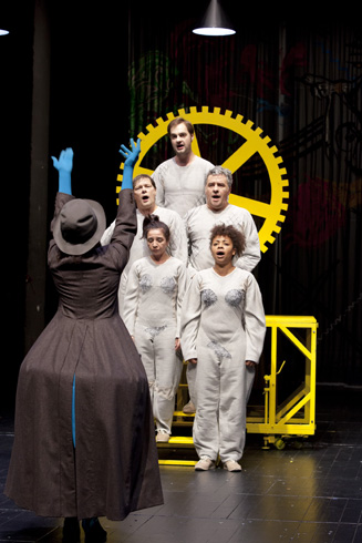 Le scénographe Philippe Marioge et le compositeur Christian Paccoud, les deux vieux complices de talent de Novarina, déclinent le vocabulaire que l’on connaît. La scénographie est dans la lignée de l’Acte inconnu et du Vrai sang, sur fond noir, éclairé par la toile peinte par l’auteur, cubes et éléments géométriques aux couleurs vives dessinent l’espace abstrait du jeu au rythme des belles mélodies fort bien chantées par les acteurs. On aurait aimé plus de musique, sur le mode de l’Opérette imaginaire, et entendre davantage la belle voix d’Olivier Martin-Salvan, l’horrible patron meneur de troupe.