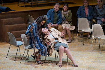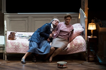 Pelly a mis au rancart les imageries d’un Moyen Age de troubadours en carton-pâte. Il a, avec justesse et humour, transféré l’épopée des croisés dans notre temps où la bourgeoisie nantie s’ennuie autant que les noblions d’autrefois. Au premier acte, dans un gymnase- salle des fêtes de ce qui pourrait être une banlieue chic de l’ouest parisien, voilà le comte déguisé en gourou-fakir à l’indienne – avec perruque, tatouage au front et poses de yogi -, dispensant bonne parole – et caresses - à un public de dadames avides de sensations. Les hommes sont à la guerre, les lits sont vides… La comtesse Adèle, bourge popote, veuve dévorée par l’ennui (et le manque), débarque en voiture, pique sa crise puis ouvre les portes de son intimité. Chez elle, à l’acte deux, le décor glisse côté cour, du salon aux larges fenêtres à la chambre à coucher et à la salle de bain attenante. Côté jardin il débouche sur la cuisine-salle à manger. Ory et ses quatorze chevaliers sont au rendez-vous dans leurs robes Armée du salut, ils vont dévaliser la cave, s’en mettre jusque-là de vins jusqu’à rouler sous la table. Pas un temps mort, les cocasseries rebondissent comme des balles de ping-pong et se mêlent comme en écho à la musique. Et quand au final le quiproquo met dans un même lit la comtesse, le comte et le page amoureux travesti en fille, le comble de la loufoquerie érotique est atteint.