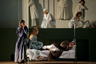 Chez Pouchkine auteur en 1833 de la nouvelle qui inspira Tchaïkovski soixante sept ans plus tard, Hermann, le flambeur, finit sa vie dans la folie. Modeste Tchaïkovski, frère du compositeur, auteur du livret, le suicide d’une balle tirée dans la tête et Lisa, sa bien-aimée se jette dans la Neva. Dans la transposition du metteur en scène russe Lev Dodin, c’est l’état de démence qui est la clé de l’œuvre et qui en signe le démarrage. Dans la chambre d’un hôpital psychiatrique Hermann revit, par séquences, les moments de sa vie qui l’ont amené là. Sa chambre s’ouvre sur tous les lieux de son existence, la chasse aux trois cartes est dans l’immobilité…