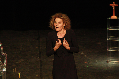 La belle mise en scène de Thierry Harcourt donne de la discrétion à l’univers télévisuel (à la création, la mise en scène avait été confiée à un réalisateur TV, Pierre Koralnik) et intensifie la relation entre le personnage et le public. Les spectateurs sont vraiment les interlocuteurs de l’actrice. Ce monologue est un dialogue permanent avec eux. Cette actrice, Nathalie Mann, est rayonnante, narquoise, puncheuse, éclatante. On la verra en fin de soirée se draper de la robe pontificale. Mais qu’importe la pompe ecclésiastique ! Nathalie Mann est toujours dans le feu de la dialectique, du débat, de l’ironie, de l’enjouement et de la passion. Le spectacle pourra choquer quelques croyants dogmatiques mais, après un grand succès aux festivals off d’Avignon en 2010 et 2011, il arrive à Paris avec une actualité évidente. C’est un moment aussi troublant que séduisant.