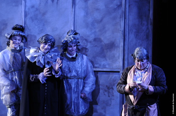 Chaque personnage a droit à sa touche baroque-barjot, le roi Pétaud en robe de chambre fatiguée (Rodolphe Briand en fait une attendrissante rondeur), l’inquiétant Alexibus en trois pièces blanc, col Mao et perruque noire à la Khadafi (Vincent Deliau très vilain-pas beau de BD), Girandole en falbalas de première communiante (Mélody Louledjian irrépressible oie blanche aux belles envolées de colorature), et, pour le Prince Léo une garde robe complète, de Zorro en cape noire à la tenue de trappeur en passant par un costard doré pour prince rock’n roll. : le rôle a été écrit pour une voix de femme, un travesti qu’Emmanuelle Goizé endosse avec sa voix souple, ses aigus joueurs et son sens du jeu toujours alerte et charmeur.