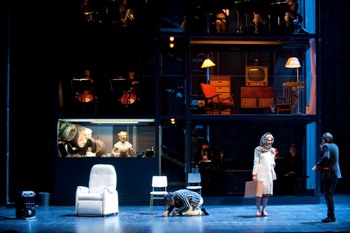 Les Boulingrin opéra bouffe de Georges Aperghis d’après la comédie de Georges Courteline. Klangforum Wien, direction Jean Deroyer, mise en scène Jérôme Deschamps, décors et accessoires Laurent Peduzzi, costumes Macha Makeïeff, lumières Dominique Bruguière. Avec Lionel Peintre, Doris Lamprecht, Jean-Sébastien Bou, Donatienne Michel-Dansac.
