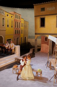 Les substitutions fonctionnent en naturel et sans accroc. Comme fonctionnent les décors en trompe l’œil de François Cabanat d’une Venise par temps de pluie où les bourrasques font voler les coiffes et les masques des musiciens groupés sur une petite estrade côté jardin.