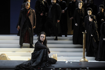 Yannis Kokkos avait monté cette Medea virtuose de Cherubini en mai 2005 au Capitole de Toulouse (voir webthea du 25 mai 2005), et, pour sa recréation nancéenne, il a repris les outils qui en marquèrent la réussite, les a aiguisé, peaufiné, complété. Et le charme premier opère à nouveau sous le sceau de l’élégance qui est en quelque sorte la marque de fabrique de Kokkos. On la reconnaît d’emblée dans la parfaite géométrie de ses décors qu’il décline en noir, blanc et or, les lourds portails mobiles coiffés de chapiteaux, la poupe du navire qui amène Jason et sa Toison d’Or, le flambeau de vengeance de Medea, brûlant dans un triangle renversé, autant d’images symboles en parfaite adéquation avec le sujet et sa musique. Tout comme les costumes d’encre et de lumière, les maquillages blêmes des chœurs et leurs coiffes dressées en casques qui leur donne un petit air japonisant.