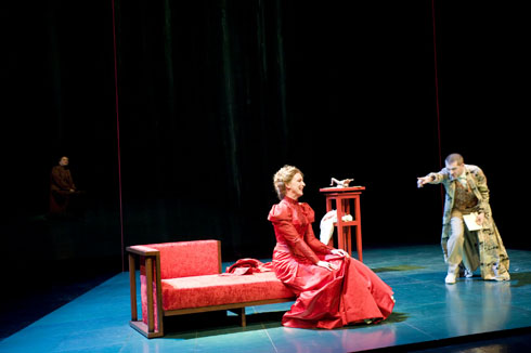 Christophe Maltot interprète ce mari nerveux à l’esprit détraqué, pathétique peintre raté. Silhouette fragile au visage émacié, il incarne bien l’artiste nerveusement déséquilibré qui pourrait être un double de Strindberg. Depuis quelques temps il reçoit la visite d’un homme qui prétend s’intéresser à lui. Clara Simpson est Tekla, l’épouse d’Adolf. Ecrivain sans talent, elle est adoré par son mari qu’elle considère plus comme un substitut à l’enfant qu’ils ont perdu que comme son époux et qu’elle appelle « petit frère ». Tekla, dans la magnifique robe rouge sang (les costumes de Thibaut Welchlin sont superbes, élégants, racés) se laisse prendre au piège de son ancien mari et comprend trop tard le piège. Yordanoff ici déploie toutes les nuances d’un talent que l’on savait grand et qui s’avère en pleine maturité. La moindre variation de sentiment et d’intention est perceptible derrière une impassibilité glaçante. Il joue avec les nerfs de chacun, monte et abaisse le curseur de la tension générale avec la satisfaction de l’homme sûr de son pouvoir. Machiavélique, il conduit ainsi le peintre à la mort à force de harcèlement moral, et garde les mains propres. Sous la main de Schiaretti, Créanciers apparaît dans toute la force de la construction psychologique digne des films noirs d’Hitchcock. Le crime ici est parfait. Comme dans Mademoiselle Julie d’ailleurs, où le suicide de la jeune fille est un crime déguisé, manigancé par la puissance de manipulation de Jean. Schiaretti met à vif la complexité des rapports de pouvoir entre les personnages, rapports de classe et de sexe dans une mise en scène aux contours effilés comme le fil de la lame avec laquelle Julie se tranche la gorge.