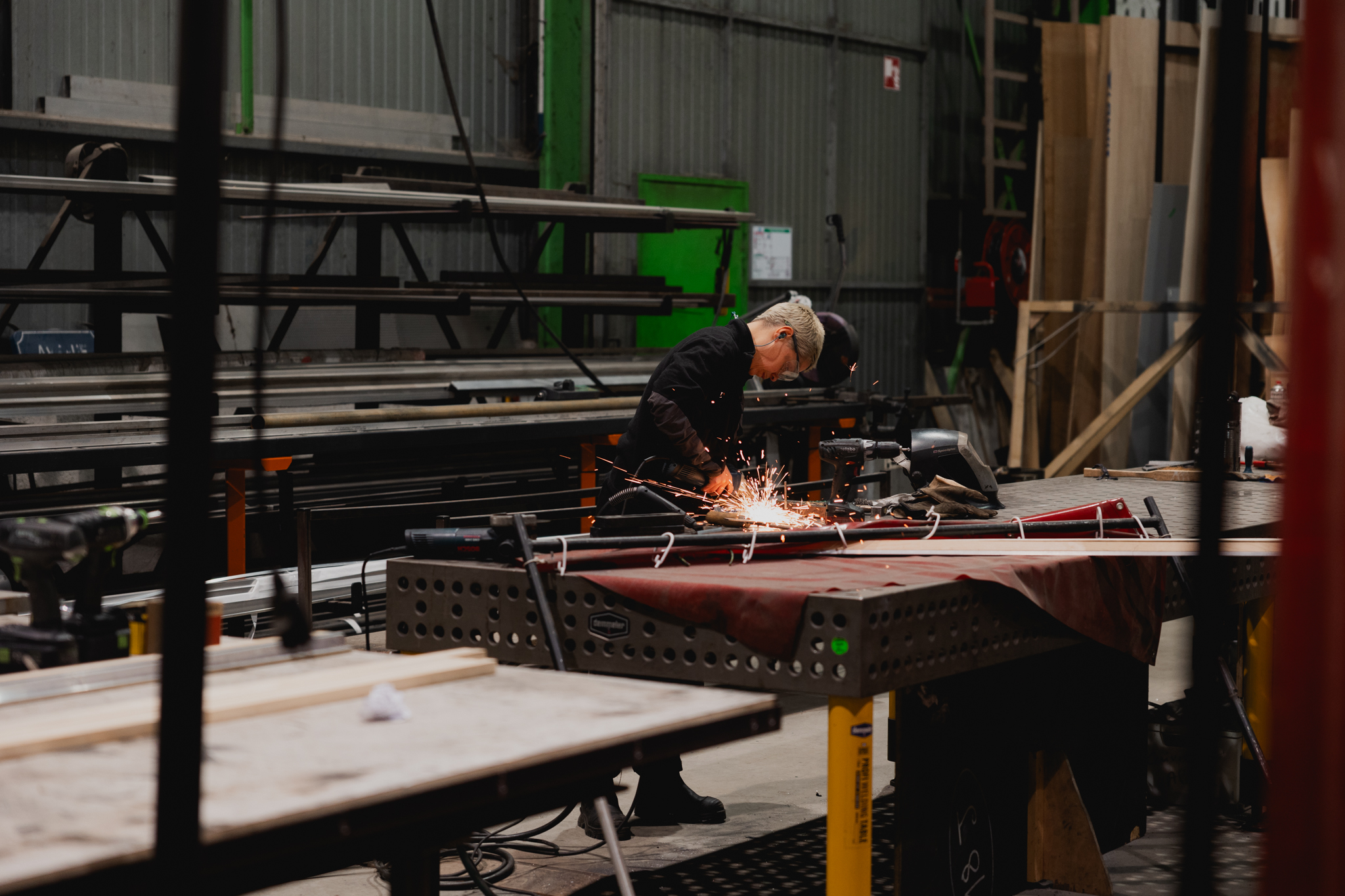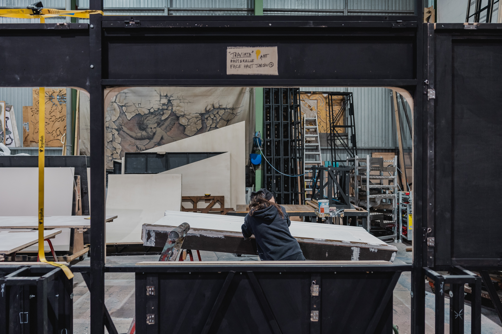 Un peu plus loin, Alison présente un grand puzzle de toiles tendues, posées sur des tréteaux, qui figureront les rues d’une ville de gratte-ciel. « Ici pour les toiles, on a recours à l’impression numérique, mais il faut toujours penser à ce qu’on ne voit pas, en l’occurrence ce qui fait tenir ces tissus : des châssis en bois et alu suivant les besoins. » Pour les fabriquer, Alison peut compter sur un stock de bois et de métal et un atelier en fond de hangar où les postes de soudure côtoient les scies et ponceuses. Pour le sol, des carreaux anthracite qu’il faudra « maroufler », coller, sur scène le jour venu. « Ce qui me plaît, c’est que chaque opéra nous amène de nouveaux défis, il faut qu’on réfléchisse, qu’on apporte des solutions… » Des solutions techniques auxquelles des dessinateurs techniques puis des bureaux d’études « sructure » travaillent en amont de la fabrication. Pour la récente Traviata, Alison Bigeard se souvient d’un défi technique : un balcon de 7 mètres de long. Pour répondre à une demande aussi complexe sans dénaturer l’intention de départ, il a fallu renforcer la structure, et donc mécaniquement en réévaluer les coûts.