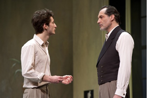 Sa version s’articule autour de plusieurs postulats. Il situe la tragédie dans la première moitié du XX° siècle, comme en témoigne les costumes de Virginie Merlin, et trouve une relation avec la Grèce antique dans la scénographie de Lili Pézanou. L’intérieur d’une maison ouvrant à travers trois baies sur une terrasse et une vue maritime d’un paysage du Péloponnèse où se situe Trézène, lieu de l’action, avec une mer scintillante et en mouvement grâce au beau film projeté de Nikos Pastras. Un décor qui n’est pas sans rappeler celui d’ Electre de Yannis Kokkos (Antoine Vitez – 1986), mais semble aussi inspiré par le peintre Yannis Tsarouchis. Dans cet espace, finement éclairé par Pascal Noël, Michael Marmarinos s’attache surtout à établir des relations concrètes entre les actions et les personnages. Mais, à trop vouloir côtoyer la réalité, la mise en scène glisse parfois dans un réalisme inapproprié avec quelques artifices éculés qui altèrent la profondeur de la tragédie, devenue ainsi plus proche d’un drame bourgeois. Quant aux 1654 alexandrins qui composent la pièce, ils sont bien naturellement débarrassés de toute emphase surannée et si la fameuse musicalité de la langue racinienne y perd quelques plumes, elle passe la rampe avec modernité et clarté. Pour autant, il semble superflu d’avoir ajouté quelques coquetteries linguistiques qui n’ajoutent rien aux propos.