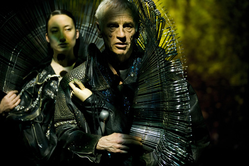 Le travail magistral de vidéo (Ief Spincemaille), allié à l’extrême finesse du jeu des acteurs, atteint de sommets de précision et de beauté plastique. Sur scène se déroulent les différents moments du drame et simultanément, projetés sur l’immense mur de plaques de métal, rappelant le matériau des armures des chevaliers, les visages en gros plan paradoxalement nous font pénétrer dans l’intimité de chacun. Contribuant à cette intimité, la sonorisation (Diderick de Cock) donne aux chuchotements une présence troublante grâce aux micros munis de bonnette de mousse qui assourdit la voix, en gomme les hauteurs, mais ceci au prix d’un appareillage disgracieux et encombrant qui n’a pas la discrétion des micros HF. Dommage. Si on devait faire une autre réserve, ce serait un regret de l’effacement du théâtre sur la scène au profit du dispositif des projections vidéo qui happent le regard. Si parfois on suspecte un effet facile, on est aussitôt emporté par les acteurs magnifiques, dont le visage, pourtant presque fixe, exprime mille nuances de sentiments ; ainsi de Jeanne, immense Abke Haring, petit être frêle armée de sa seule foi qui affronte le pouvoir sans frémir et dont le simple vêtement rouge dans lequel elle est drapée annonce la fin tragique. On retrouve avec plaisir Johan Leysen qu’on a la chance de voir sur les scène françaises, sombre et troublant Gilles de Rai et Katelijne Damen en reine dégénérée puis en mère affligée. Les riches costumes noirs de Tim Van Steenbergen aux sombres reflets inquiètent avec ces mains cousus qui semblent agripper les personnages et dont on ne comprend pas très bien le sens — représentent-elles les parasites du pouvoir, les crimes de chacun ?—, mais qui fascinent et ajoutent au climat malsain empuanti par l’immoralité de la fin d’un monde. Comme pour purifier ce cloaque de ses intrigues, tel un chœur antique, les voix séraphiques des chanteurs du Collegium Vocale Gent qui accompagnent l’action s’élèvent dans les belles lumières sépulcrales de Enrico Bagnoli, et font chanter les étoiles au diapason du chant funèbre de Jeanne et Gilles.