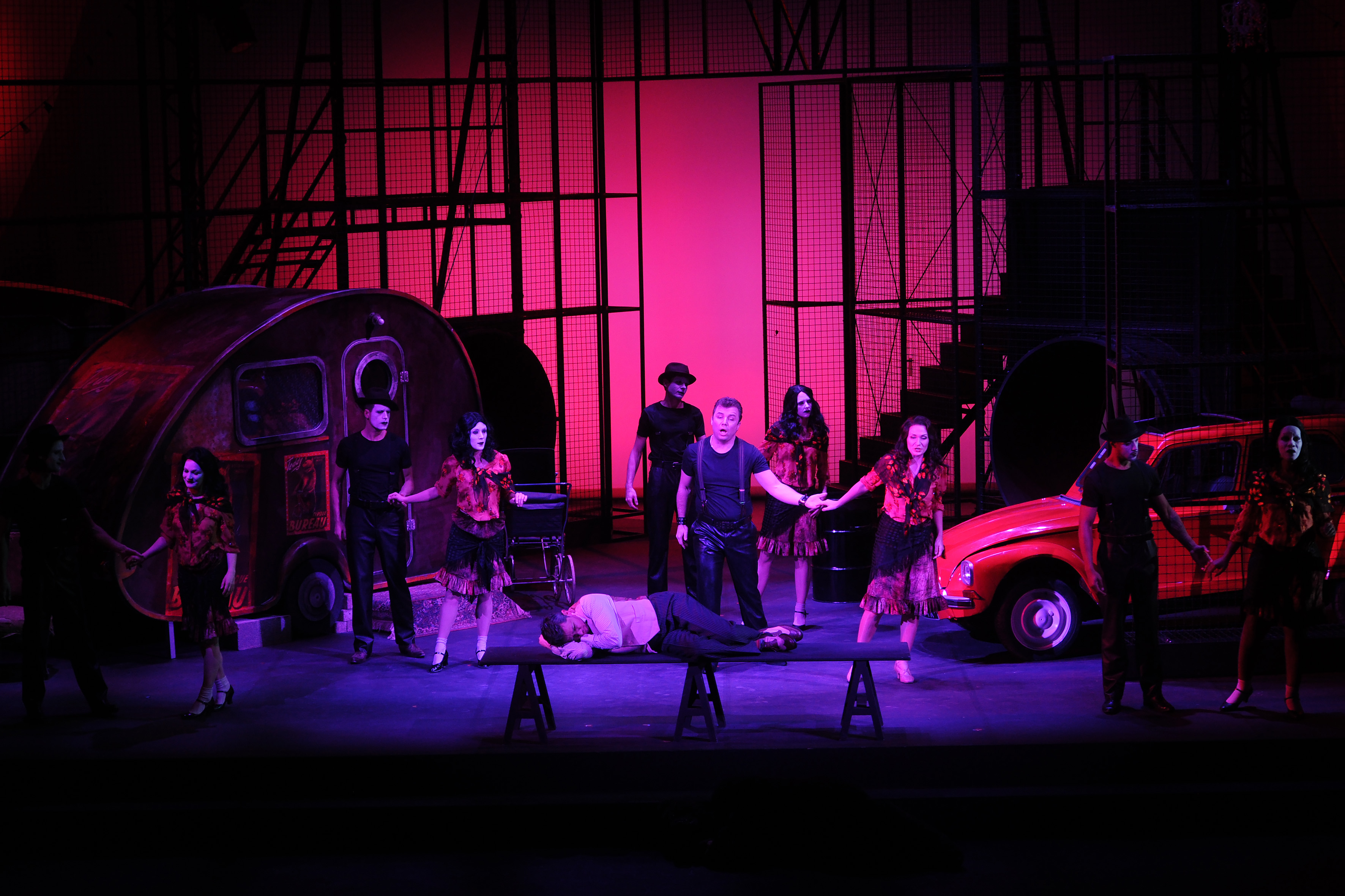 Relier les deux œuvres en une seule soirée découle d’une sorte de bon sens. Le metteur en scène roumain Silviu Purcarete qui, sur cette même scène, avait ébloui avec le rare Artaserse de Vinci, (voir – 7.11.2012 -WT 3490 ) aime promener les symboles. Il a confié à Helmut Stürmer son scénographe la conception d’un décor unique à variations multiples autour d’un ancrage commun. Une structure métallique aérée suggère pour Aleko un campement de gitans nomades, avec roulottes, caravanes et voitures, acrobates, jongleurs, ours dressé. Un décor qui, quand le rideau se lève sur Francesca da Rimini, se resserre en géhenne nocturne où errent ce qui reste des morts, leurs squelettes, ossatures mobiles qui continuent à copier les poses et les gestes des vivants. Des détails, costumes ou personnages, du premier rebondissent dans le second comme une sorte de ponctuation : on revoit passer les robes de gitanes, l’ours dressé, les Pierrots acrobates, le géant sur échasses, le nain et l’apparition de la 2CV décapotable où les amants d’Aleko ont pratiqué leurs ébats et qui vient, comme un plan fixe de cinéma, conclure le spectacle.