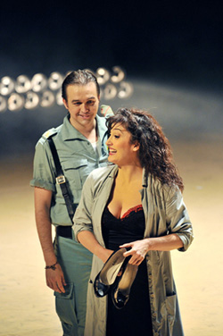 Calixto Bieito a concocté cette mise en scène pour le Festival de Perelada, avec son théâtre en plein air et des limitations logistiques évidentes. Se passant des décors traditionnels il a transformé la caserne sévillane en un terrain d’entraînement de la Légion espagnole, et la taverne de Lilas Pastia en un espace de célébration du type « botellón » (grosse bouteille contenant des liquides indéfinis, devenue point central de rencontres entre jeunes dans un lieu public). Il a changé la montagne des contrebandiers en un terrain vague, lieu de commerces et de trafics en tout genre organisés par des gitans en cylindrées Mercedes. Il a transporté le quatrième acte, dans un monde irréel, onirique, lyrique et violent à la fois. In fine, une mise en scène plus fidèle au texte original que celle de Martin Kusej , vue au Châtelet en 2007, et sans doute moins universelle que celle présentée à l’Opéra Comique en 2009.