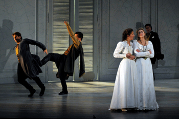 La reprise de la mise en scène de David Mc Vicar (voir Webthea du 14 décembre 2005) s’est faite sans changement important ; elle est classique, finement ciselée, mais non sans défaut. Transposée à l’époque romantique l’histoire « giocosa » de l’inconstance féminine est en porte à faux sensible, car l’époque romantique ne se prêtait pas trop au badinage contrairement à l’époque précédente. Les choses de l’amour y étaient traitées par la littérature et le théâtre avec une gravité et une solennité extrêmes comme dans le Werther de Goethe (1774) où Charlotte revient à Albert son fiancé dès qu’il rentre de son voyage, et quitte celui qu’elle aime en réalité.