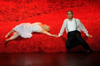 Ils bénéficient il est vrai d’une direction d’acteur hors pair menée par la fine lame qu’est Stéphane Braunschweig. Metteur en scène et scénographe, ancien directeur du Théâtre National de Strasbourg, aujourd’hui à la tête du Théâtre National de la Colline, Braunschweig manie en prestidigitateur les arts de l’abstraction et de la stylisation. Une façade anthracite isole au premier acte les protagonistes dans leurs questionnements identitaires. Une porte surmontée du mot OPER (opéra) en lettres majuscules lumineuses indique l’entrée et la sortie du chemin à suivre. Une forêt de quilles géantes, vertes comme l’herbe, accueille la fuite éperdue de Grete. Le bordel vénitien se love sur des mamelons de végétation rouge flamme...