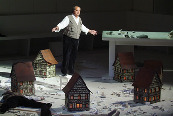 L’espace fermé proposé par le décorateur Christian Schmidt a rendu par moments l’atmosphère irrespirable, et la mise en scène de Claus Guth a manqué d’originalité. Ses allusions shakespeariennes tirées par les cheveux à la fin du second acte ainsi que son acharnement contre le pauvre Sixtus Beckmesser que le peuple châtre –fictivement- lors de cette nuit de cauchemar, étaient excessives à la lecture du livret et totalement incompréhensibles pour quelque public que ce fût. Si Claus Guth avait des comptes à régler avec Sixtus Beckmesser, personnage certes pas très sympathique, il aurait mieux valut qu’il les réglât en famille.