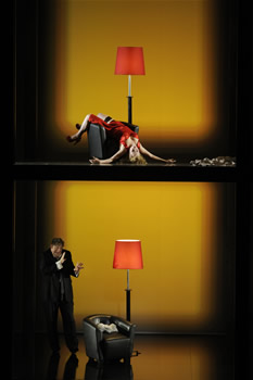 A la différence de la mise en scène de Willy Decker (voir Webthea des 9 mai 2006 et 19 octobre 2009) qui découpe la scène en profondeur sur deux ou trois plans, Philipp Himmelmann a choisi de tout représenter sur un seul plan –dans un décor de Raimund Bauer- avec six cases identiques (trois cases en ligne sur deux niveaux) étanches entre elles, où il a placé ses acteurs principaux sans qu’aucun d’eux ne se trouve jamais dans la même case qu’un autre. Cela a sans doute demandé beaucoup de travail : bien que ne se voyant pas, la coordination des gestes des acteurs est parfaite. Mais cela a sans doute aussi autorisé les postures osées de Marietta et Paul, qui auraient peut-être été plus difficiles à interpréter si les acteurs avaient joué l’un près de l’autre. On peut remarquer par ailleurs que la mise en scène a éliminé pratiquement tout symbole religieux dans ce décor (procession, croix, chasubles..).