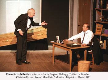 Fermeture définitive, comédie de Benjamin Bellecour, mise en scène Stephan Meldegg, avec Roland Marchisio, Christian Pereira, César Méric, au Théâtre La Bruyère, Paris 9, Tél. 01 48 74 76 99.
