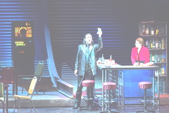 Le Far West est loin, l’or est dans les banques et les mineurs sont les malfrats de la mafia, sous- produits d’Al Capone, en cuir et lunettes noires. Acte I : les gratte-ciels de Wall Street surplombent le bar en tôle ondulée (le saloon de Minnie) où ils se trémoussent et où clignotent des machines à sous. Acte II : la cabane de Minnie a été revue par Walt Disney et s’est transformée en une caravane capitonnée de rouge grenadine pour poupée Barbie avec nounours en peluche. Deux Bambis en stuc montent la garde dans la neige et clignent des paupières quand les amoureux s’embrassent. Acte III : la forêt californienne a disparu sous une montagne de voitures labellisées années cinquante, Dodge, Buick, Studebaker, Chevrolet mises à la casse. Puis, ultime surprise du chef : la réapparition de Minnie, gainée de pourpre et de paillettes en haut d’un escalier de music-hall tandis qu’en toile de fond, le Lion de la Metro Goldwyn Mayer se tord le museau sur de muets rugissements. Une pluie de dollars couronne ses noces avec le bandit repenti.