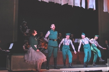 A l’Athénée les Brigands ont ramené le poids lourd (plus trois heures de musique et de gags) à un attelage léger. Exit la fosse : les instrumentistes sont sur scène et deviennent des personnages. Exit le chœur : les chanteurs s’y substituent en petits groupes ou en sifflotant… Quelques fantaisies détournent l’original en le pimentant. Ainsi, Wanda, la fiancée de Fritz, le gentil soldat sur lequel la duchesse jette son dévolu, change de sexe et devient Krak, tendre troufion, béatement amoureux du même Fritz qui l’aime de même et ne comprend rien aux avances de la bienfaitrice qui, en trois phrases, l’a propulsé de deuxième classe à général galonné. Ainsi le baron Grog que la duchesse convoite en guise de lot de consolation se révèle être une femme, obligeant l’héroïne à se résigner à prendre le dédaigné prince Paul pour époux. Car, comme le veut la morale « quand on n’a pas ce qu’on aime, il faut aimer ce qu’on a ! ».