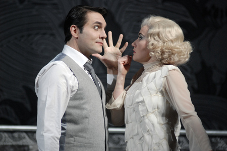 Et c’est justement sous les traits de cette dernière que Stéphanie d’Oustrac s’est présentée pour jouer le personnage de la grecque Hélène, dite « de Troie ». Elle a tout de cette fameuse star –la beauté, la silhouette, l’assurance et la gouaille-, tout sauf la vulgarité du jeu. Qui connaît la filmographie de Jean Harlow ne contredira pas ces affirmations. Vocalement la soprano française a dû ajuster précision et volume en début de représentation ; passé ce premier temps son émission a retrouvé la fermeté, la précision et l’élégance qu’on lui connaît, ainsi que la jovialité « bon enfant » dont elle a l’habitude d’investir ses personnages. A ses côtés, la pétillante Caroline Fèvre, a dessiné Oreste sous les traits d’un « fils à papa » -Agamemnon en l’occurrence, nous sommes avant la Guerre de Troie-, festif et désinvolte, clairement porté sur le sexe, comme d’ailleurs, le reste des personnages de l’histoire.