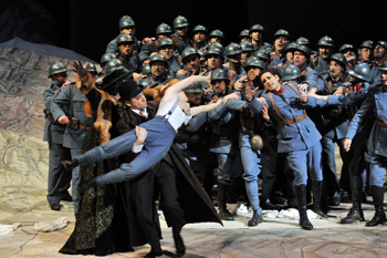 Juan Diego Flórez, victime d’une indisposition alimentaire le soir de la dernière, a néanmoins chanté divinement. Prudent, il a seulement donné quatre contre-uts des neuf attendus dans la chanson « Ah mes amis » ; mais au lieu de les faire exploser sans aucun raffinement, comme à son habitude, il les a parfaitement liés aux notes qui suivaient. Patricia Ciofi dans le rôle de Marie nous a rappelé en tous points Natalie Dessay, créatrice du rôle dans cette production. Dans le registre dramatique – en en « faisant des tonnes » pour la grande joie du public - ou alors en enchaînant à la perfection roulades et vocalises avec une grande assurance. La ressemblance avec son modèle était si stupéfiante de vérité que par moments on aurait même préféré la copie à l’original. Complétait le trio Pietro Spagnoli dans le rôle de Sulpice, le sergent bourru et sympathique. La grande présence de Victoria Livengood dans le rôle de la Marquise de Berkenfield - la scène où elle essaye au piano de faire chanter Marie restera dans les mémoires- a été quelque peu écornée par les petits défauts de prononciation de la mezzo américaine.