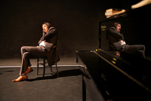 Dans une scénographie épurée qui évoque autant les violences du ring que le vide de la solitude, Armel Veilhan, silhouette longiligne et dégingandée, ratiocineur vertigineux , extirpe, entre rage et rire, tous les sucs, cocasses, tragiques, ironiques, absurdes de ce qui s’avère une brûlante quête existentielle que ponctue un bref intermède pianistique. « Pour donner crédit à l’aventure, il fallait que le comédien joue du piano, mais il n’était évidemment pas question d’interpréter une des Variations Goldberg , « Armel a choisi une œuvre du japonais Tôru Takemitsu » précise le metteur en scène qui parsème sa réalisation scénique de détails allusifs à l’œuvre de Thomas Bernhard, des livres, « échappés de ce pénitencier que sont les bibliothèques » posés en vrac sur le piano, aux chaussures de cuir fauve qui nous renvoient au fameux placard à chaussures du récit Origines écrit en 1975.