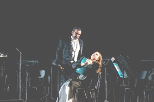 Franck Ferrari visiblement prend plaisir à enfiler à nouveau les quatre peaux du diable qu’il avait déjà interprété lors de la précédente reprise. Voix stable, diction claire, jeu amusé, il reste l’un des atouts de la production. Stefano Secco en revanche peine un peu à crédibiliser le rôle-titre, la voix est claire, le jeu enjoué, mais la présence est molle, le personnage, il est vrai, exige de l’héroïsme, à la fois musical et théâtral. Des trois incarnations de femmes, c’est l’Olympia de Jane Archibald qui domine le lot avec ses aigus qui s’échappent en vrilles et sa naïveté de poupée robotisée. En muse Kate Aldrich démarre avec une certaine hésitation puis trouve en Nicklausse, le comparse, la bonne dimension d’autorité et de lumière.