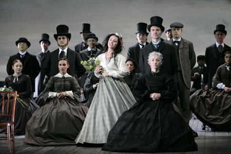 Du romantisme allemand de la campagne (autrichiènne ?) à celui de la ville (italienne ?) : le paysage champêtre, à Paris, est devenu citadin à Lyon ; là où Gilbert Deflo fait évoluer ses personnages dans un cadre ouvert et multicolore, David Allen les plonge dans un monde fermé et lugubre – le ciel qui apparaît de temps en temps au fond du décor de Gideon Davey est gris, nuageux, inquiétant- ; les chœurs de la première production qui évoluaient à leur aise, tantôt habillés en fermiers, tantôt en courtisans, ont été transformés en de simples citoyens - élégamment vêtus par Gideon Davey-, et contraints d’exécuter des chorégraphies, certes spectaculaires –bravo Maxine Braham !- mais aussi réductrices...
