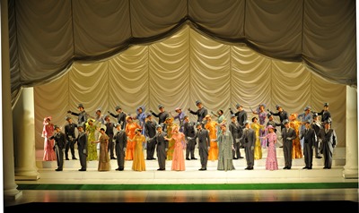 Le savoir-faire de Carsen, épaulé par Tim Hatley pour les décors, Anthony Powell pour les costumes, Lynne Page pour la chorégraphie, fait se dérouler les lieux de toutes les péripéties dans un glissement perpétuel où tout s’enchaîne sans le moindre accroc ou temps mort.