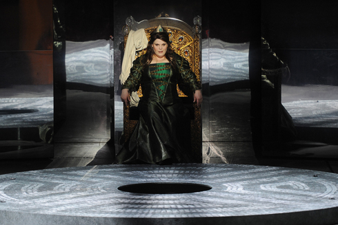 Dès le lever du rideau on a tout de suite compris que nous nous trouvions dans une forêt. Une forêt impénétrable peuplée d’arbres singuliers aux formes féminines, avec de mystérieux parallélépipèdes, aux surfaces polies où se reflétaient les branchages et les feuillages sombres. Des morts jonchaient le sol. Une terrible bataille venait de s’achever et les vainqueurs fêtaient la victoire, l’épée encore en sang à la main. La forêt s’est ensuite transformée en château, les parallélépipèdes prenant le dessus, et le régicide a donc pu avoir lieu. Jean-Louis Martinoty a joué cette fois-ci la carte de l’orthodoxie : Macbeth fait partie des œuvres –telle Tosca de Giacomo Puccini ou Andréa Chénier d’Umberto Giordano- où le respect à la lettre du libretto est la seule option possible. Il a donc demandé à Bernard Arnould, son décorateur de longue date, de styliser les arrière-fonds du drame, sans sortir d’une reconstruction forcément théâtrale du Moyen Âge. Le décorateur s’est exécuté avec grand professionnalisme et, en complicité avec le costumier Daniel Ogier, a créé un monde féérique habité, dans la forêt comme dans le château, par d’insaisissables esprits –une vraie trouvaille- qui arrêtaient de temps à autre leurs déplacements afin de prédire l’avenir aux plus puissants. Comme à son habitude le metteur en scène a travaillé les dires et les gestes du moindre personnage –il adore ce travail- et, fidèle au livret, il n’a pas négligé l’assassinat de la famille innocente de Macduff, et les lamentations qui ont suivi le drame, mettant en lumière le seul moment de tendresse d’une œuvre brutale et sans amour.