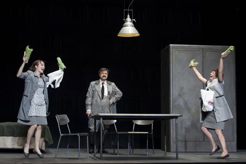 Sa mise en scène affirme la théâtralité en rendant visible la machinerie théâtrale. L’esthétique se réfère au théâtre de tréteaux brechtien jusque dans la tonalité grise. Antonia, qui est le moteur de l’action, rappelle les personnages féminins brechtiens dans leur détermination à agir. Fo lui prête la richesse de l’imagination pour parer le réel des couleurs qui lui manquent, pour illuminer cette vie de chien où on en est réduit à manger de la pâtée pour chien. Mompart se réfère à Charlie Chaplin mangeant sa chaussure dans ce théâtre que Fo qualifiait de « théâtre de la faim ». La scénographie de Cristian Taraborrelli s’inspire d’ailleurs de la cabane de la Ruée vers l’or, en équilibre instable au bord d’une falaise. L’appartement d’Antonia évoque un radeau qui tangue dangereusement et menace d’engloutir les naufragés sociaux dans les eaux noires de la misère. Dans cet espace sombre se déroule une farce politique faite de quiproquos, de scènes hautement comiques, de cadavre gonflé à l’hélium et fourré dans le placard, et de grossesses mystérieuses. Si l’on comprend le point de vue, on regrette un peu que le parti pris de la mise en scène édulcore justement l’exubérance et le rythme de la commedia dell’arte qui pour Fo est le moteur de la contestation politique mais la justesse de la distribution et le talent des acteurs font le reste et très bien. L’Antonia de Brigitte Rosset a du punch et de l’énergie à revendre, et il en faut pour mobiliser Margharita (Camille Figureo) jeune femme effarouchée dont la mollesse et la couardise contrastent avec le caractère effronté d’Antonia. En contrepoint, le duo masculin formé par les époux (Juan Antonio Crespillo, Mauro Bellucci) est excellent, sans oublier François Nadin, qualifié de Joker, qui se glisse en douce dans la peau de plusieurs personnages.