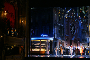 Si l’idée est sommaire, sa réalisation fourmille de trouvailles et d’ingéniosité dans les décors, les costumes, les éclairages et les effets spéciaux d’une vidéo qui fait plonger l’action dans un océan démonté. L’eau reste omniprésente : un lever de rideau sans musique mais non sans bruitage précède l’ouverture : plitch, platch, une pluie diluvienne s’abat sur un coin de rue si réel qu’on croit s’y trouver pour de bon, des klaxons font pouët pouët, des sirènes hurlent, des personnages pittoresques traversent l’espace en boucle. Le réalisme du décor de Heike Scheele vous en met plein les mirettes : façades glauques percées de fenêtres, bouche de métro taguée, église à rosace tournante, bar à enseigne multiple, sex-shop avec poupées gonflables qui, un acte plus loin devient boucherie puis boutique de prêt à porter pour mariées. Les idées fusent, on passe d’étonnement en émerveillements, les fiançailles du prince deviennent carnaval sur scène et dans la salle où les spectateurs sont arrosés de confettis écarlates.