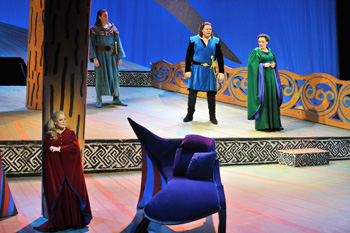 Moins osée que la production de Olivier Py (Webthea du 13 mai 2009) ou encore de celle de Peter Sellars avec les projections de Bill Viola (Webthea du 3 novembre 2008), elle a gardé toute sa force et tout son mystère. Les trois décors de David Hockney, faussement naïfs, présentent au cours des trois actes la même perspective en courbe. Au premier plan, à gauche de la scène, la chambre d’Isolde, le château du roi Marke et l’arbre mystérieux, véritables centres dramatiques de chaque acte, agissent comme des masses stellaires qui provoquent la trajectoire parabolique du pont du bateau, de la forêt et de la falaise de l’île de Kareol.